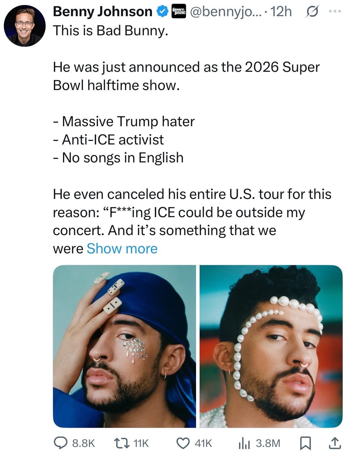 It was just announced that 3x Grammy award winning performer Bad Bunny would be headlining the 2026 Super Bowl halftime show in February. Because of how especially moronic everything is right now, social media predictively erupted into a moral and tribal panic. Whether over his anti-ICE comments or his musical catalog being predominantly in Spanish, MAGA influencers were simply not having it.