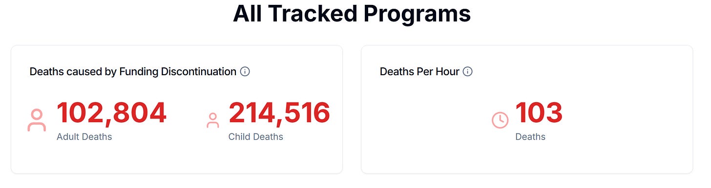 Ultimately, the most important effect of DOGE cuts won't be spending cuts but lives lost. Many of the program cuts were for programs that saved lives or were keeping people alive. One peer-reviewed estimate found that, as of today, the cuts will lead to the deaths of nearly 215,000 children and 103,000 adults.